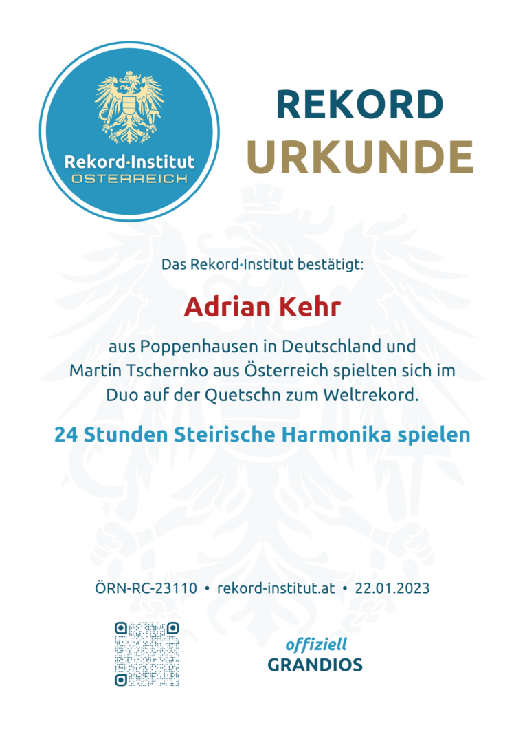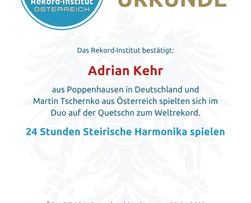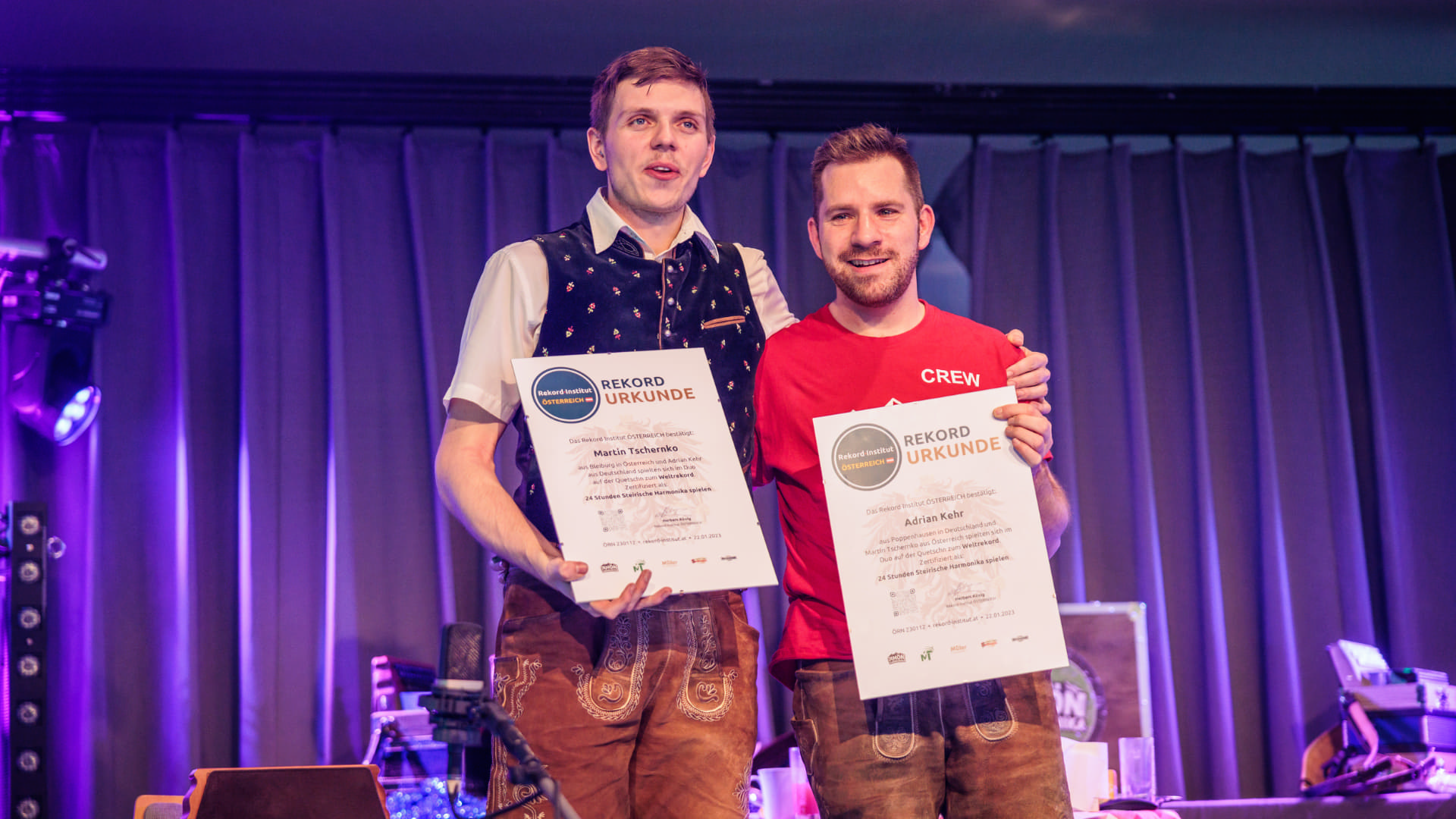 Martin Tschernko aus Österreich und Adrian Kehr aus Deutschland haben eine Ausdauerleistung vollbracht, die weit über das übliche Maß hinausgeht. Vom 21. auf den 22. Jänner 2023 spielten sie im Bürgerhaus Ebersburg/Weyhers 24 Stunden nonstop auf der Steirischen Harmonika. Dieser Weltrekord würdigt das längste Duo-Spiel auf diesem Instrument und beweist die enorme physische und mentale Stärke, die hinter dieser alpinen Musiktradition steckt.