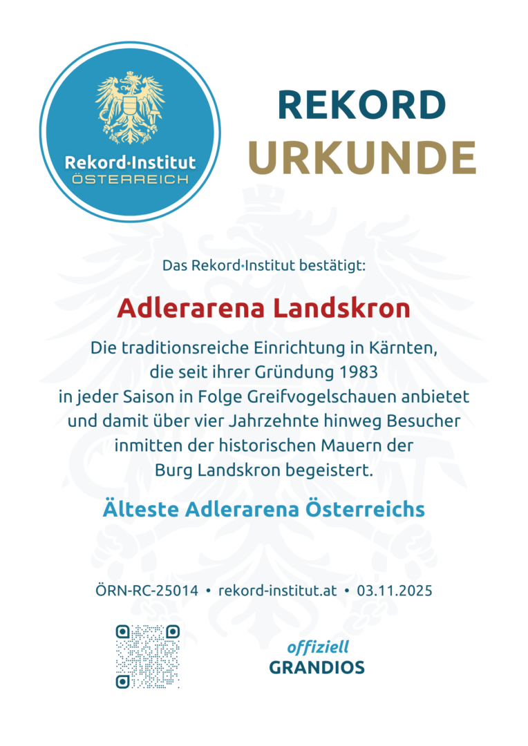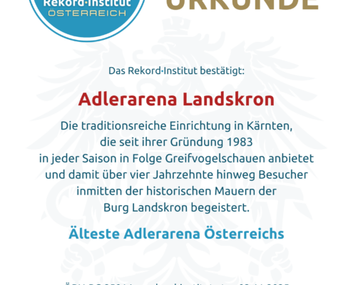 Die Adlerarena Landskron ist eine herausragende Symbiose aus historischer Kulisse, beeindruckender Tierschau und engagiertem Naturschutz. Der Titel „Älteste Adlerarena Österreichs“ ehrt mehr als vier Jahrzehnte leidenschaftlicher Arbeit. Damit ist diese Einrichtung offiziell eine grandiose Besonderheit unserer Heimat und ein unvergessliches Highlight in der österreichischen Ausflugslandschaft.