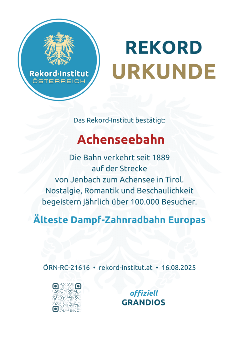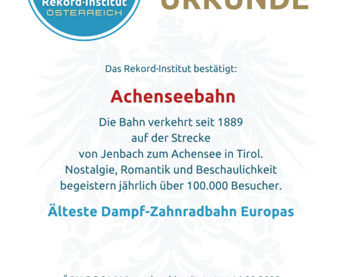 Seit dem Jahr 1889 schnauft und dampft sie unermüdlich von Jenbach im Inntal hinauf zum größten See Tirols. Die Achenseebahn ist offiziell als die älteste, rein mit Dampf betriebene Zahnradbahn Europas zertifiziert. Als technisches Denkmal aus der Ära der späten k. u. k. Monarchie repräsentiert sie die Pionierleistung der Erschließung des hochalpinen Raums und hat sich ihren ursprünglichen Charakter über mehr als 130 Jahre bewahrt.