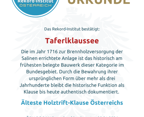 Der Taferlklaussee ist weit mehr als nur ein Gewässer; er ist ein monumentaler Zeuge der österreichischen Wasserbau-Tradition. Der Titel „Älteste im Originalzustand erhaltene Holztrift-Klause Österreichs“ ehrt die visionäre Kraft der damaligen Baumeister und macht diesen Ort offiziell zu einer grandiosen Besonderheit unserer Heimat.