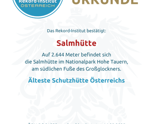 Die Salmhütte ist die „Mutter aller Schutzhütten“. Der Titel „Älteste Schutzhütte Österreichs“ ehrt die ununterbrochene Funktion als Schutzraum seit dem 18. Jahrhundert. Damit ist die Salmhütte offiziell eine grandiose Besonderheit und der historische Ankerpunkt der österreichischen Alpingeschichte.