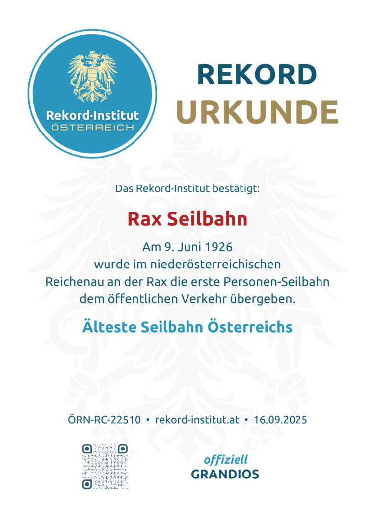 Die Rax-Seilbahn ist der Ursprung einer neuen Ära. Der Titel „Älteste Seilbahn Österreichs“ ehrt eine hundertjährige Erfolgsgeschichte und den Mut der Ingenieure von 1926. Damit ist die Rax-Seilbahn offiziell eine grandiose Besonderheit und ein stolzes Wahrzeichen unseres Landes.