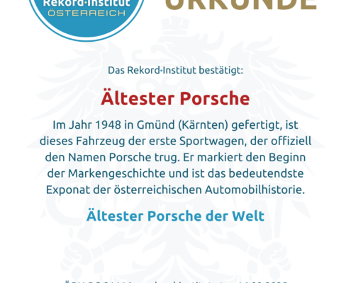Heute beherbergt Gmünd das einzige private Porsche Automuseum Europas, genau dort, wo von 1944 bis 1950 die ersten Fahrzeuge in präziser Handarbeit entstanden. Die Sammlung mit ihren handgehämmerten Aluminium-Karosserien ist eine Hommage an den österreichischen Erfindergeist. Die Zertifizierung durch das RIO dokumentiert diesen Ort als die Geburtsstätte einer Weltmarke und als unersetzliches Denkmal der internationalen Technikgeschichte.