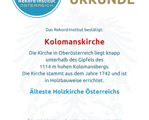 Die Kolomanskirche auf dem Kolomansberg ist ein Symbol für beständigen Glauben und meisterhafte Holzbaukunst. Der Titel „Älteste Holzkirche Österreichs“ ehrt die über 280-jährige Geschichte dieses einzigartigen Rückzugsortes. Damit ist die Kirche offiziell eine grandiose Besonderheit Österreichs und ein Ort von unschätzbarem spirituellem Wert.