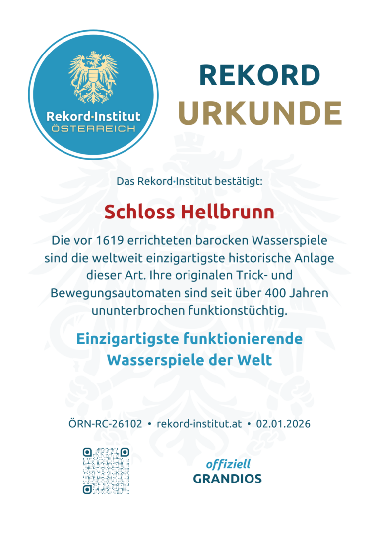 Die Wasserspiele Hellbrunn sichern sich den Weltrekord-Titel durch ihre beispiellose Originalität und Funktionalität. Sie sind ein unvergleichliches Denkmal technischer Meisterschaft, deren Beständigkeit über vier Jahrhunderte weltweit ungeschlagen ist. Damit ist Hellbrunn offiziell eine grandiose Besonderheit unserer Heimat mit globaler Strahlkraft.