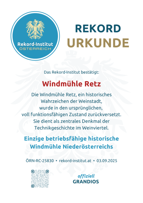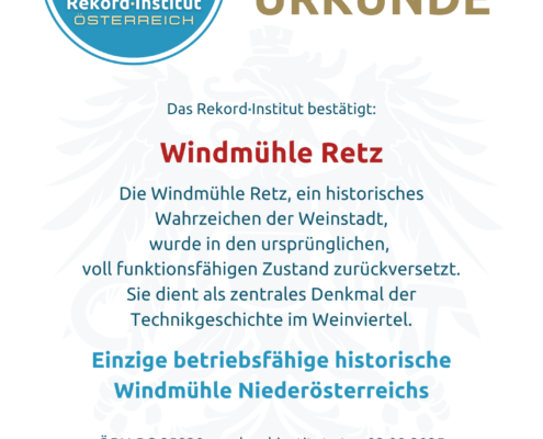 Die Windmühle Retz ist ein lebendiges, produzierendes Denkmal, das Handwerksgeschichte, Tradition und Genuss meisterhaft vereint. Ihre Bauart und Betriebstauglichkeit machen sie zur einzigen betriebsfähigen historischen Windmühle Niederösterreichs. Damit ist sie offiziell eine grandiose Besonderheit, die das Erbe des Weinviertels bewahrt und für jeden Besucher auf einzigartige Weise erlebbar macht.