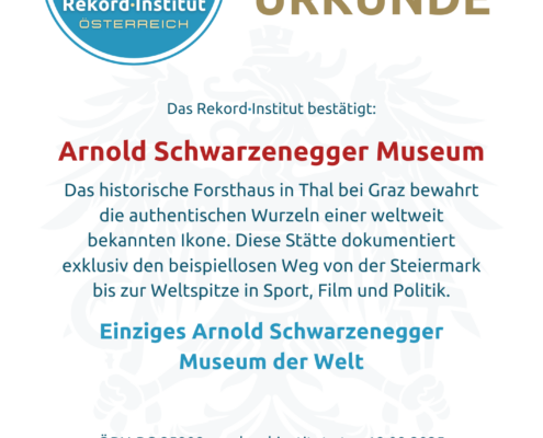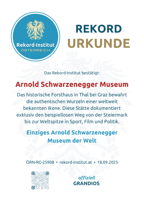Das Arnold Schwarzenegger Museum ist die offizielle Dokumentation einer der beeindruckendsten Lebensgeschichten unserer Zeit. Die Tatsache, dass das weltweit einzige Museum für diese globale Ikone in seiner steirischen Heimat steht, macht es zu einer offiziell grandiosen Besonderheit Österreichs. Ein Weltrekord, der zeigt, dass die größten Geschichten oft in kleinen Orten beginnen.