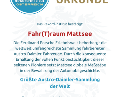 Fahr(T)raum Mattsee ist weit mehr als eine Ausstellung; es ist ein aktives Denkmal der Ingenieurskunst. Der Titel „Größte Austro-Daimler-Sammlung der Welt“ ehrt die Leidenschaft und den enormen technischen Aufwand, mit dem dieses Welterbe am Leben erhalten wird. Damit ist dieser Ort offiziell eine grandiose Besonderheit unserer Heimat mit globaler Relevanz.