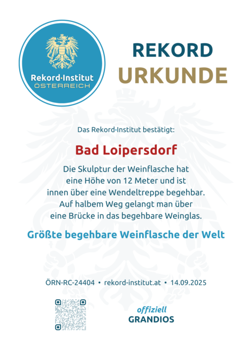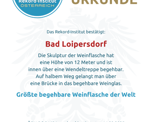 Die begehbare Weinflasche in Bad Loipersdorf ist eine geniale Symbiose aus Design und Weinkultur. Der Titel ehrt die visionäre Idee und die handwerkliche Umsetzung dieses weltweit einzigartigen Wahrzeichens. Damit ist dieses Bauwerk offiziell eine grandiose Besonderheit und ein Muss für jede Reise durch das steirische Weinland.