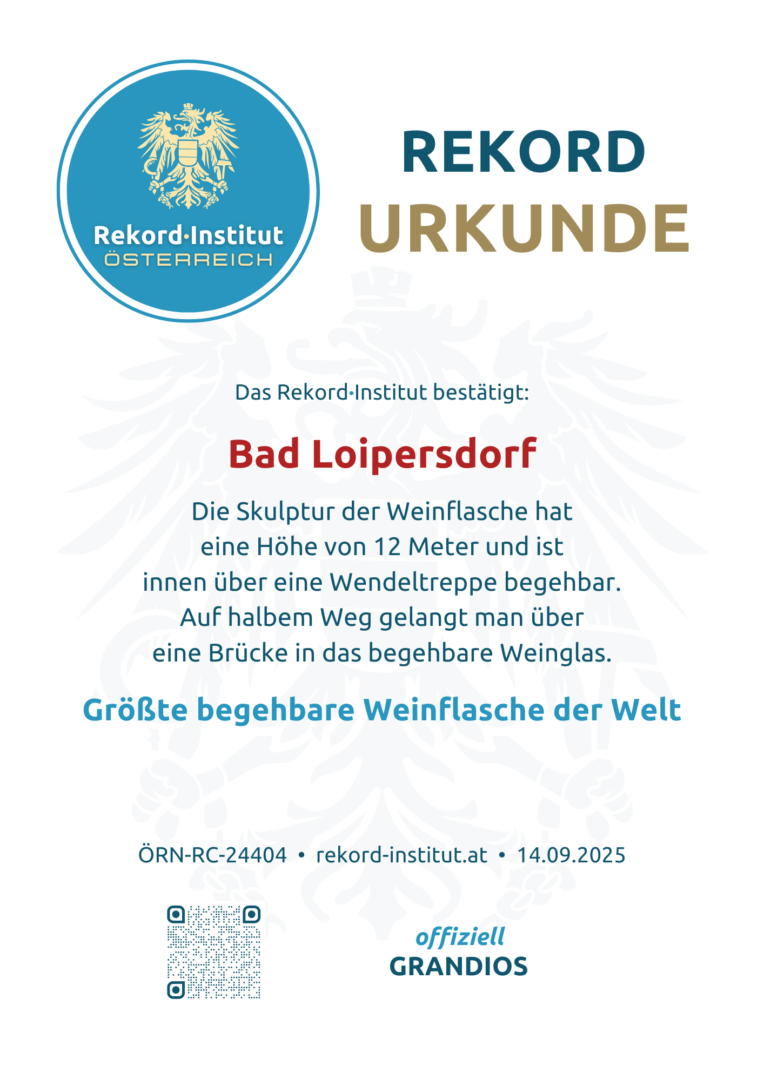 Inmitten der sanften Hügel des Thermen- und Vulkanlandes wurde ein Wahrzeichen geschaffen, das die Grenzen konventioneller Architektur sprengt. In Bad Loipersdorf steht die offiziell größte begehbare Weinflasche der Welt. Dieses Bauwerk ist weit mehr als eine Skulptur; es ist eine begehbare Hommage an die jahrhundertealte Weinbautradition der Steiermark und ein interaktives Erlebnis, das die Region auf eine völlig neue Ebene hebt.