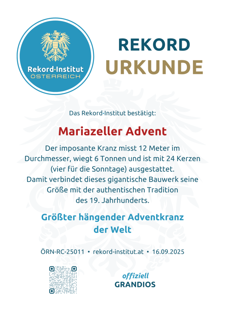 Der Mariazeller Adventkranz verbindet auf einzigartige Weise eine weltweit unerreichte Größe mit tiefer historischer Authentizität. Er ist weit mehr als ein gigantischer Blickfang; er ist ein Symbol für die Beständigkeit unserer Kultur. Damit ist dieser Kranz offiziell eine grandiose Besonderheit von Weltrang und der unangefochtene Mittelpunkt der österreichischen Adventlandschaft.