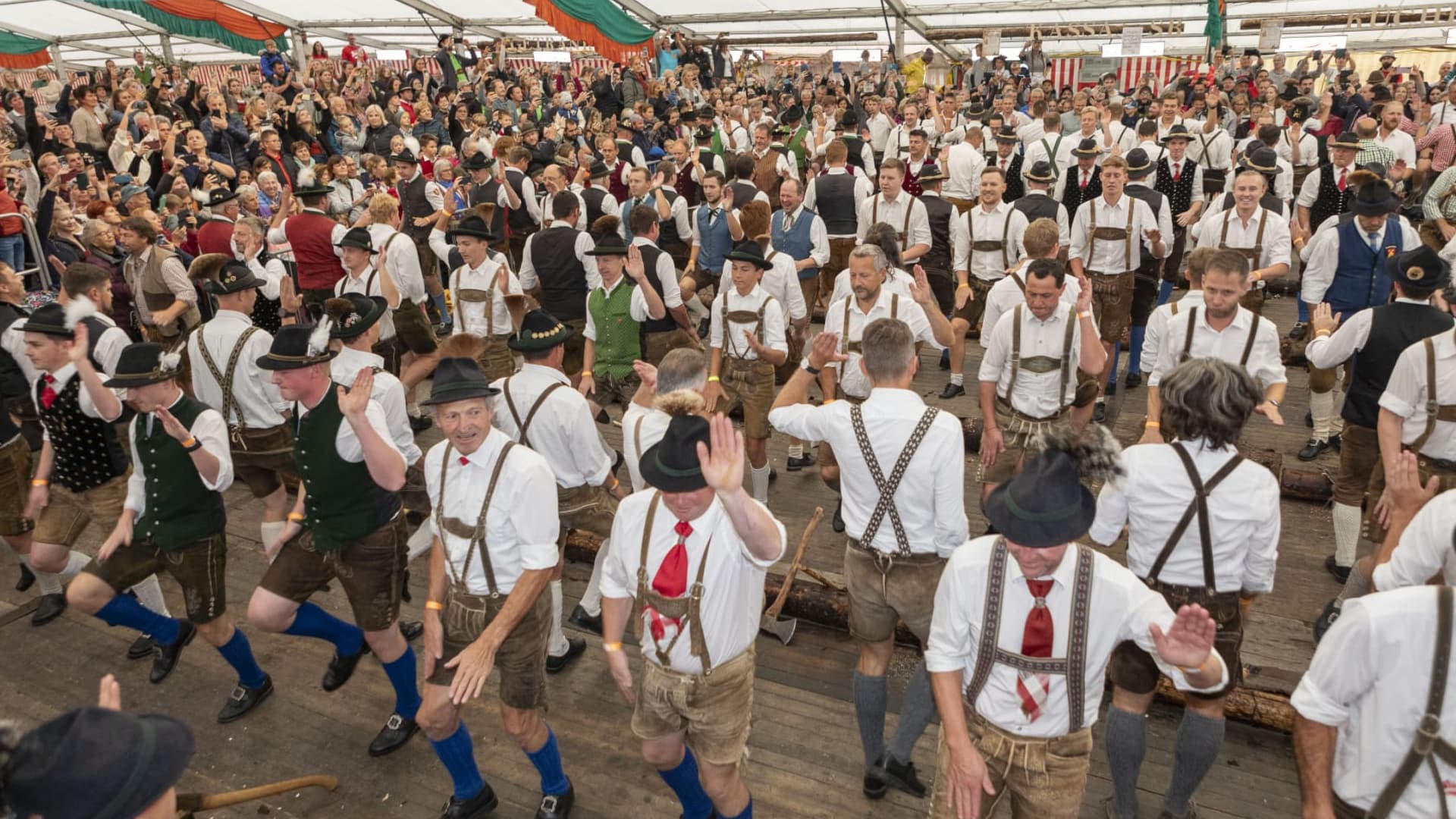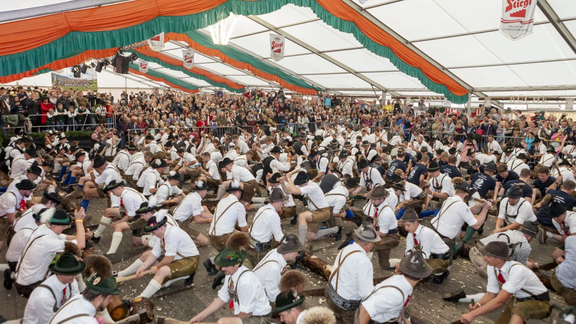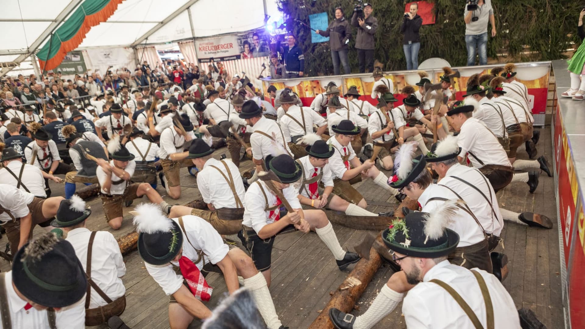 Was diesen Auftritt zum offiziellen Weltrekord macht, ist die perfekte Einheit von Tanz und theatralischer Arbeitsdarstellung. Zum Takt des „Holzhackerbuammarschs“ verwandelten die Plattler die Bühne in ein akustisches und visuelles Kraftwerk. Das rhythmische Hacken und Sägen von Holzstämmen, kombiniert mit den präzisen Schlägen auf Oberschenkel und Waden, schuf eine Dynamik, die das Publikum in Staunen versetzte. Es ist eine meisterhafte Inszenierung der historischen Holzknecht-Arbeit, erhoben zu einer sportlichen Höchstleistung.