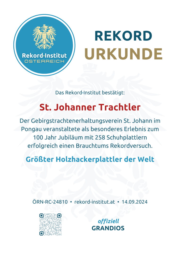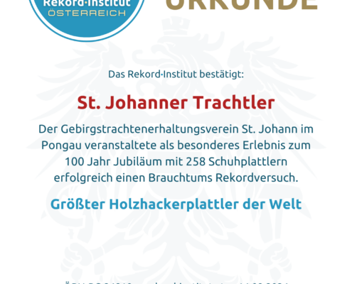 Der Holzhackerplattler in St. Johann ist eine gewaltige Demonstration von Gemeinschaft und Präzision. Der Titel „Größter Holzhackerplattler der Welt“ ehrt die Liebe zur Tradition und die Fähigkeit, diese in einem spektakulären Rahmen zu inszenieren. Damit ist diese Leistung offiziell eine grandiose Besonderheit unserer Heimat.