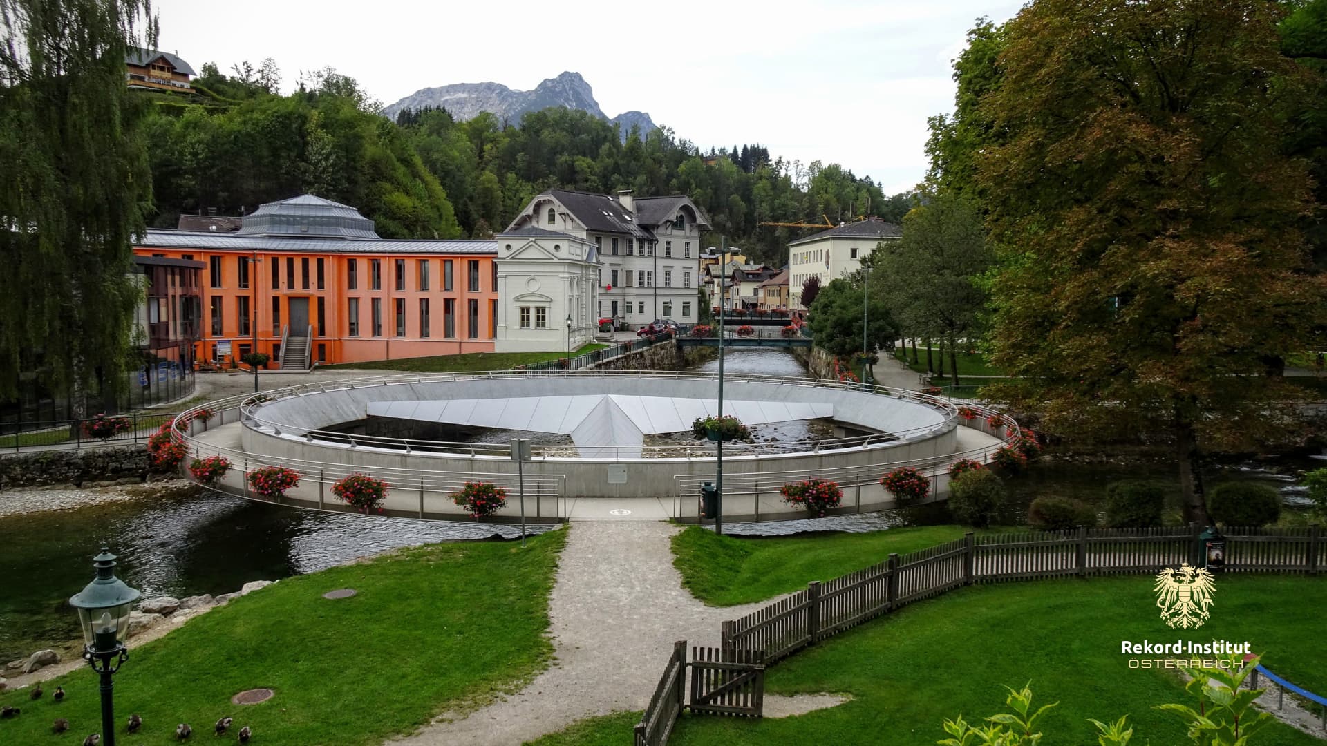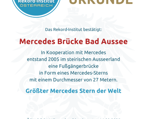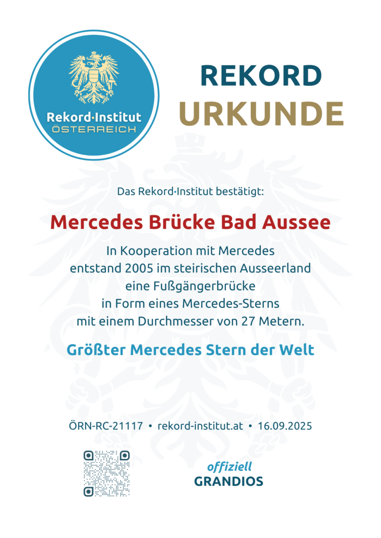 Im Kurpark von Bad Aussee, direkt über dem Zusammenfluss der Grundlseer und Altausseer Traun, befindet sich ein architektonisches Kuriosum von globalem Rang. Die im Jahr 2005 errichtete Fußgängerbrücke wurde in Form des weltbekannten Markensymbols gestaltet. Mit einem beeindruckenden Durchmesser von 27 Metern ist sie offiziell der größte Mercedes-Stern der Welt. Die filigrane Stahlkonstruktion fügt sich überraschend harmonisch in die alpine Umgebung ein und ist zu einem festen Bestandteil des Ortsbildes geworden.
