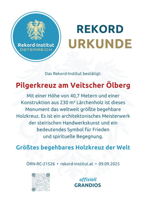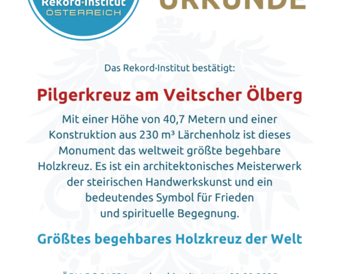Auf dem Veitscher Ölberg in der Steiermark ragt ein beeindruckendes Bauwerk in den Himmel, das weit über die Grenzen des Landes hinausstrahlt: das Pilgerkreuz auf der Veitsch. Mit einer Gesamthöhe von 40,7 Metern ist es nicht nur ein architektonisches Meisterwerk moderner Holzbaukunst, sondern offiziell das größte begehbare Holzkreuz der Welt. Es steht als weithin sichtbares Symbol für Frieden und Gemeinschaft an der Schnittstelle bedeutender europäischer Pilgerwege.