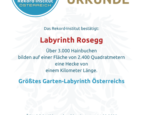 Das Labyrinth Rosegg ist eine geniale Inszenierung von Natur und Spieltrieb. Der Titel „Größtes Garten-Labyrinth Österreichs“ ehrt die aufwendige Pflege und die kreative Gestaltung dieses Ausflugsziels. Damit ist die Anlage offiziell eine grandiose Besonderheit, die zeigt, dass das Suchen oft genauso viel Freude bereitet wie das Finden.