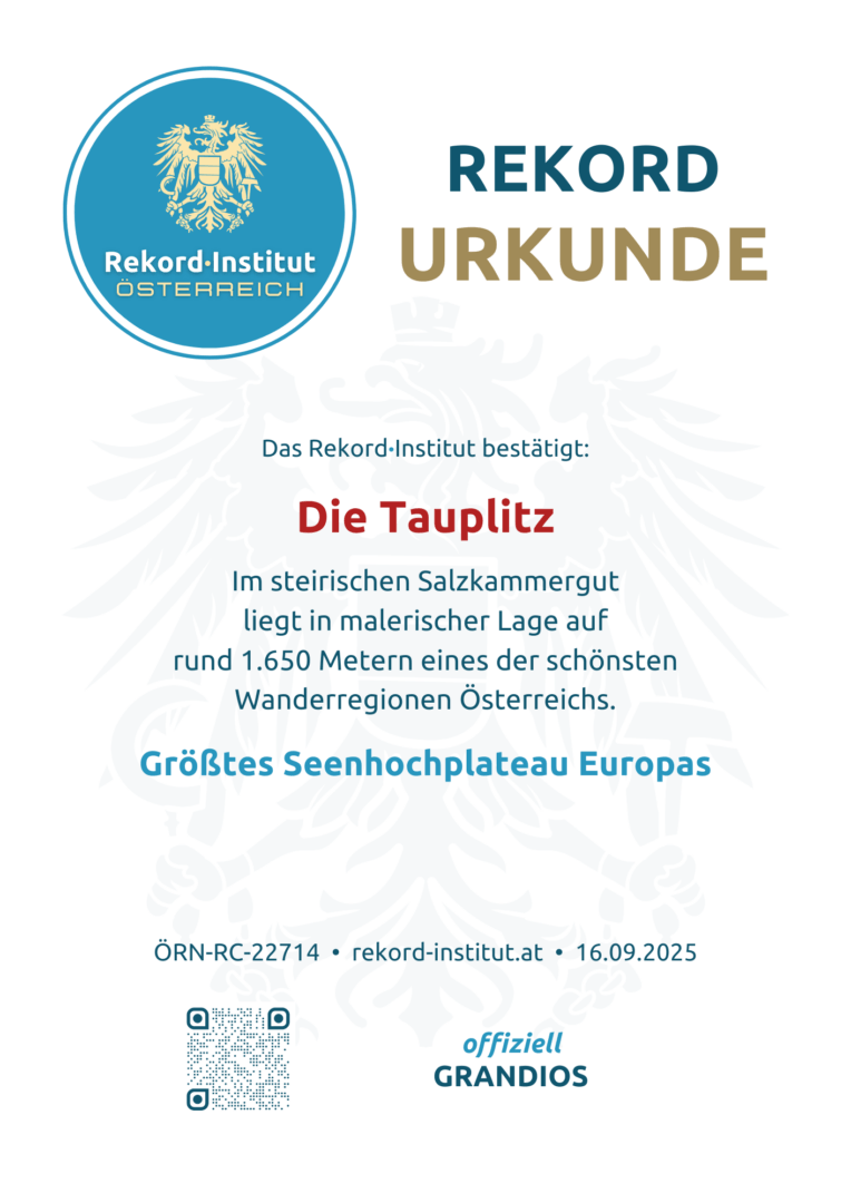 Die Tauplitzalm ist ein Naturwunder von europäischem Rang. Der Titel „Höchstes und größtes Seenhochplateau Europas“ ehrt die Einzigartigkeit dieser hochalpinen Seenlandschaft. Damit ist die Tauplitz offiziell eine grandiose Besonderheit unserer Heimat und ein unumgänglicher Fixpunkt für Naturliebhaber.