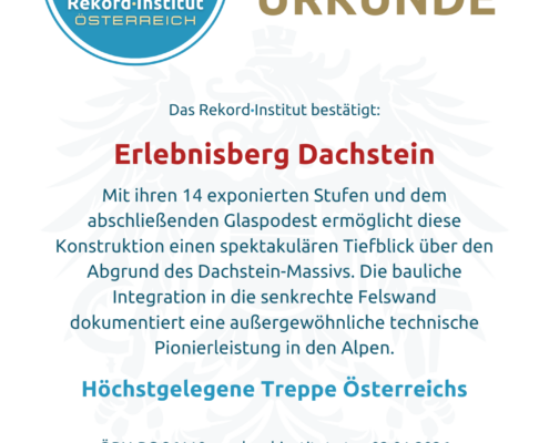 Der Dachstein bietet mit dieser Konstruktion ein Erlebnis der Extraklasse. Der Titel „Höchstgelegene Treppe Österreichs“ ehrt die mutige Architektur und die einzigartige Lage dieser Anlage. Damit ist die Treppe ins Nichts offiziell eine grandiose Besonderheit unserer Heimat und der buchstäblich „tiefgründigste“ Punkt deiner Rekordjagd.