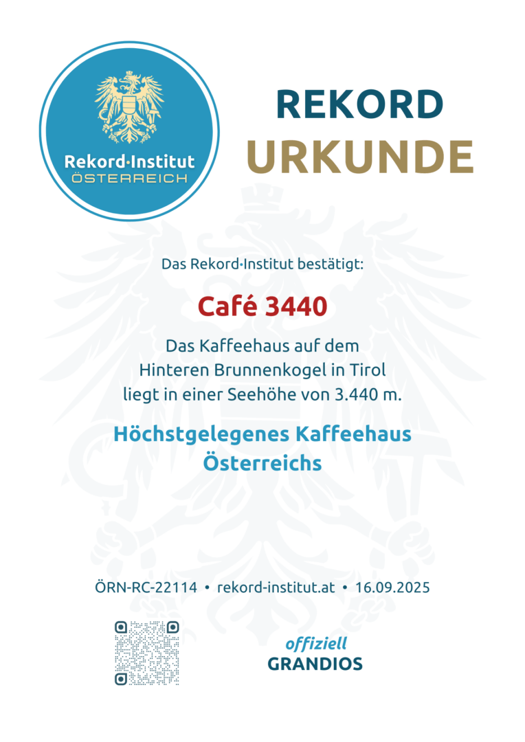 Das Café 3440 ist Österreichs höchster Aussichtspunkt für Genießer. Der Titel „Höchstgelegenes Kaffeehaus Österreichs“ ehrt die kühne Architektur und das einzigartige Erlebnis auf 3.440 Metern. Damit ist dieses Café offiziell eine grandiose Besonderheit unserer Heimat und ein absolutes Muss für jeden Alpenbesucher.