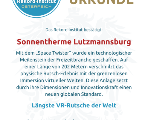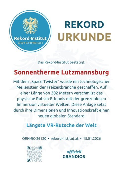Die Sonnentherme Lutzmannsburg hat mit diesem Projekt einen dauerhaften Meilenstein geschaffen. Die „Space Twister“ würdigt die Verbindung von Ingenieurskunst und digitaler Vision. Damit ist diese Anlage eine offiziell grandiose Besonderheit unserer Heimat mit weltweiter Strahlkraft.