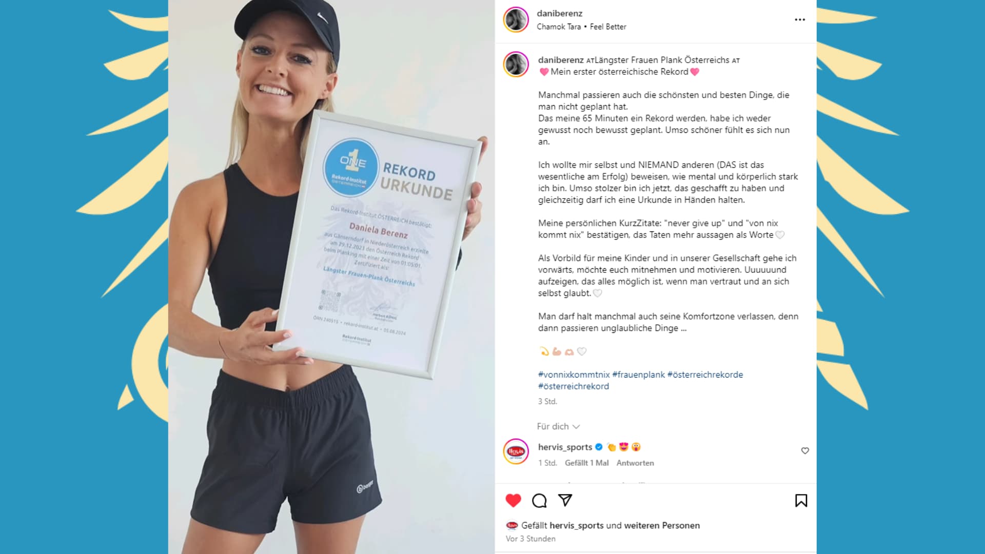 Daniela Berenz hat mit über einer Stunde im Plank die physikalischen Grenzen des Körpers herausgefordert. Der Titel „Längster Frauen-Plank Österreichs“ ehrt diese außergewöhnliche Demonstration von Konzentration und Kraft. Damit ist diese Leistung offiziell eine grandiose Höchstleistung unserer Heimat.