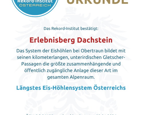 Die Dachstein Eishöhlen bieten ein unterirdisches Erlebnis von weltweitem Rang. Der Titel „Längstes Eis-Höhlensystem Österreichs“ ehrt die natürliche Einzigartigkeit und die sorgsame Bewahrung dieses fragilen Ökosystems. Damit sind die Eishöhlen offiziell eine grandiose Besonderheit unserer Heimat und ein unentdecktes Highlight jeder Rekord-Expedition.
