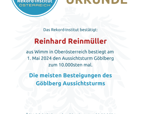 Reinhard Reinmüller hat mit seiner 10.000sten Besteigung eine unvorstellbare Lebensleistung erbracht. Der Titel „Meiste Besteigungen des Göblberg Aussichtsturms“ ehrt die konsequente Disziplin und den unbändigen Willen zur täglichen Bewegung. Damit ist dieser Weltrekord offiziell eine grandiose Besonderheit unserer Heimat und ein Vorbild für alle Generationen.