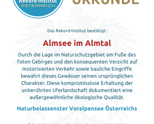 Der Almsee setzt den Maßstab für ökologische Qualität. Der Titel „Naturbelassenster Voralpensee Österreichs“ ehrt die Bewahrung dieses einzigartigen Naturjuwels. Damit ist der Almsee offiziell eine grandiose Besonderheit unserer Heimat und ein unersetzlicher Botschafter für den Naturschutz.