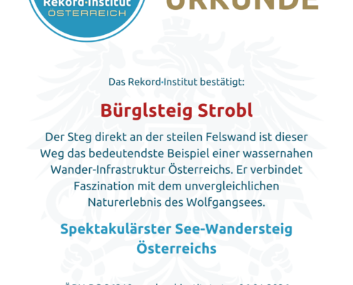 Dieser Rekord würdigt eine Streckenführung, die die vollständige Umrundung des Wolfgangsees erst zu einem lückenlosen Erlebnis macht. Die Passage am Bürglstein bietet Perspektiven, die normalerweise nur vom Schiff aus zugänglich sind. Als außergewöhnlichster Abschnitt eines österreichischen See-Rundwanderwegs setzt dieser Steg neue Maßstäbe für den modernen Tourismus und schafft eine beeindruckende Verbindung zwischen massivem Fels und der Weite des Sees.