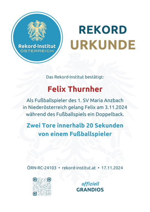 Am 3. November 2024 wurde im niederösterreichischen Amateurfußball Sportgeschichte geschrieben. Im Spiel gegen Bischofsstetten bewies Felix Thurnher vom 1. SV Maria Anzbach, dass im Fußball jede Sekunde über die Ewigkeit entscheiden kann. Innerhalb von nur 20 Sekunden erzielte er einen Doppelpack, der weltweit seinesgleichen sucht. Dieser Weltrekord würdigt einen Moment absoluter Präzision und einen Instinkt, der die Zeit für einen Wimpernschlag auszuhebeln schien.